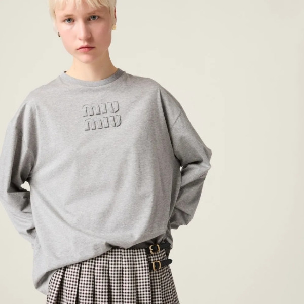 미우미우 자수 로고 코튼 티셔츠 (화이트,그레이) > 긴팔/셔츠