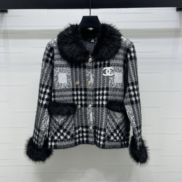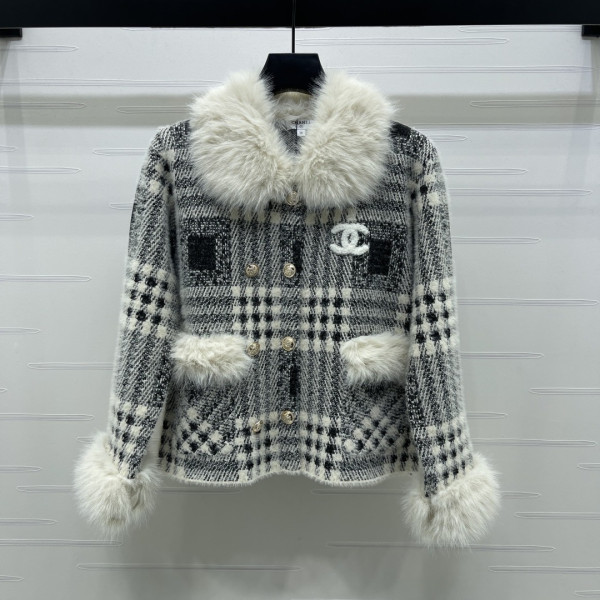 샤넬 26 신상 보아털 칼라 체크 니트 코트