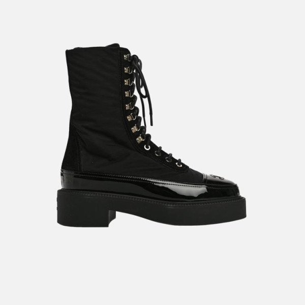 샤넬 레이스업 나일론 스웨이드 페이턴트 카프스킨 부츠